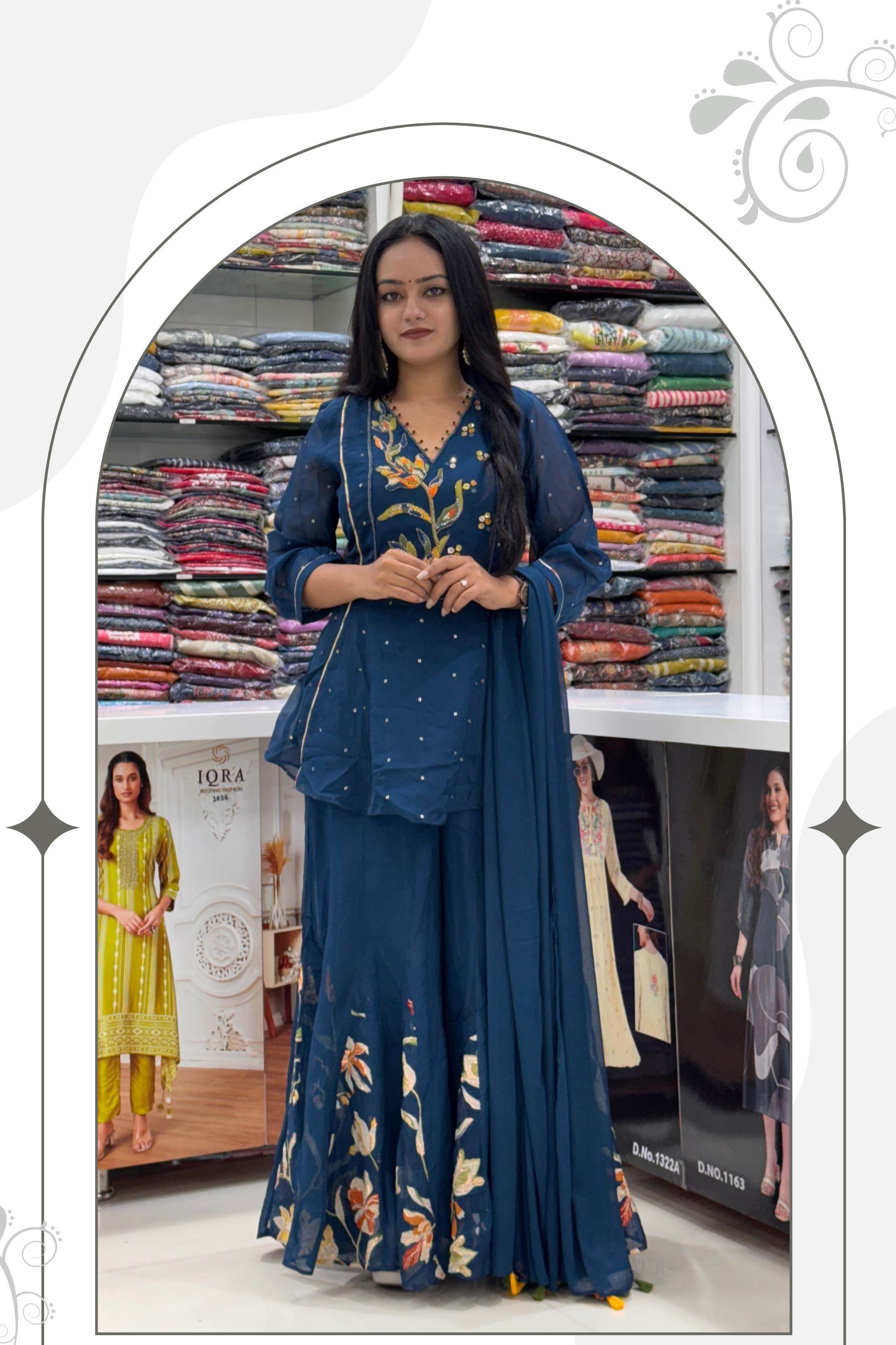 Blue Color Party Wear Designer Indo-Western Plazo Suit