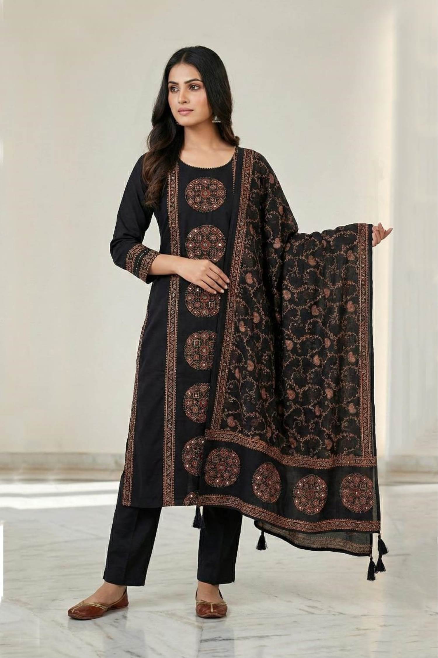 Black Color Printed Cotton Classy Kurti Set With Dupatta