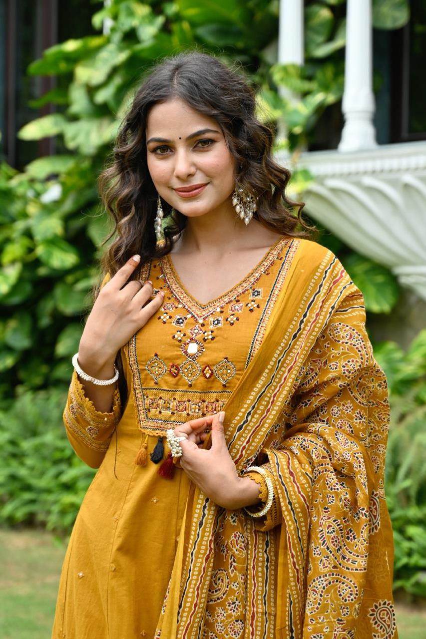 Mustard Color Printed Cotton Classy Kurti Plazo With Dupatta :: ANOKHI FASHION