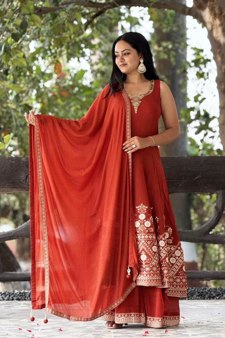Rust Color Party Wear Designer Anarkali Style Plazo Suit