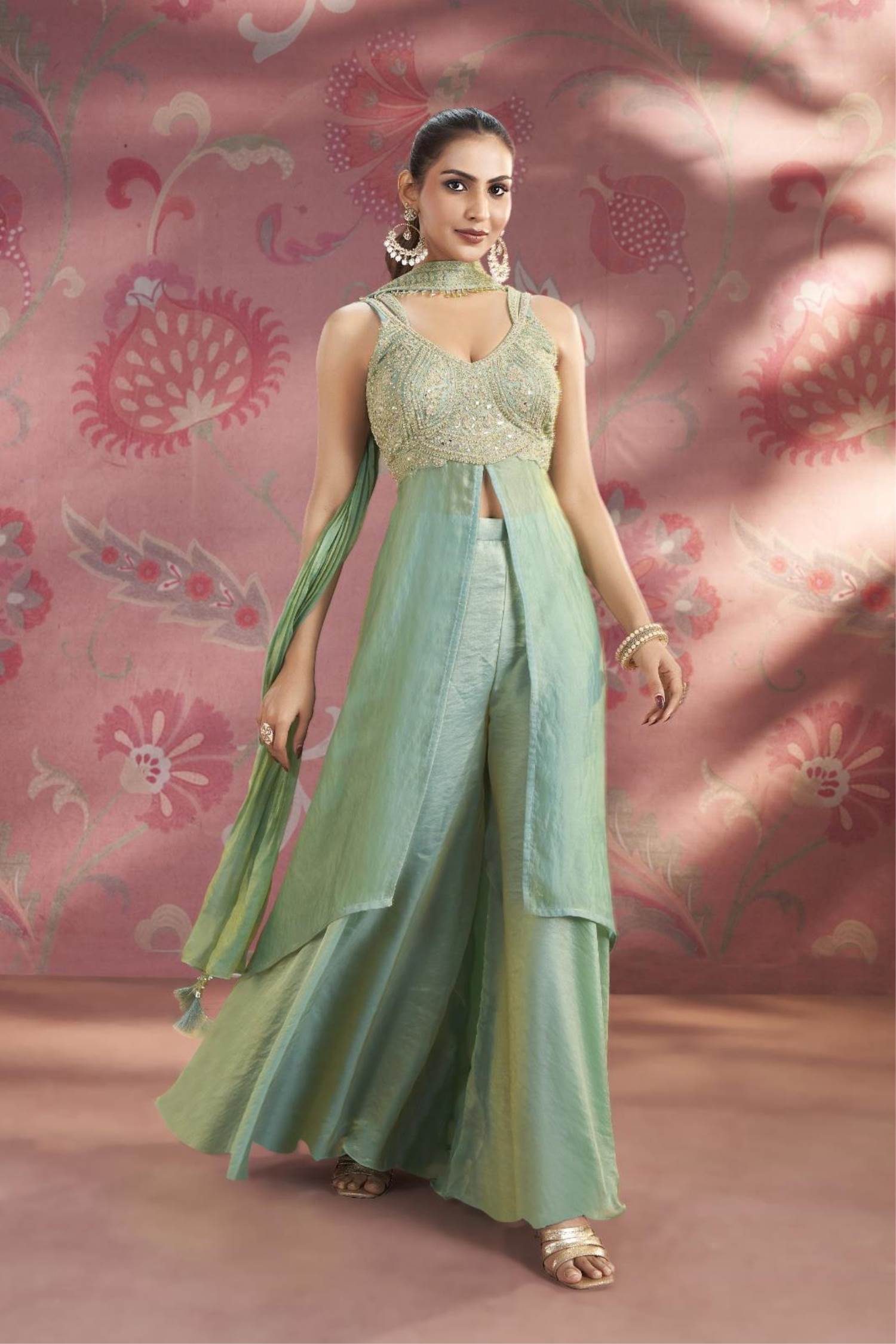 Sea Green Color Party Wear Designer Indo-Western Plazo Suit :: ANOKHI FASHION
