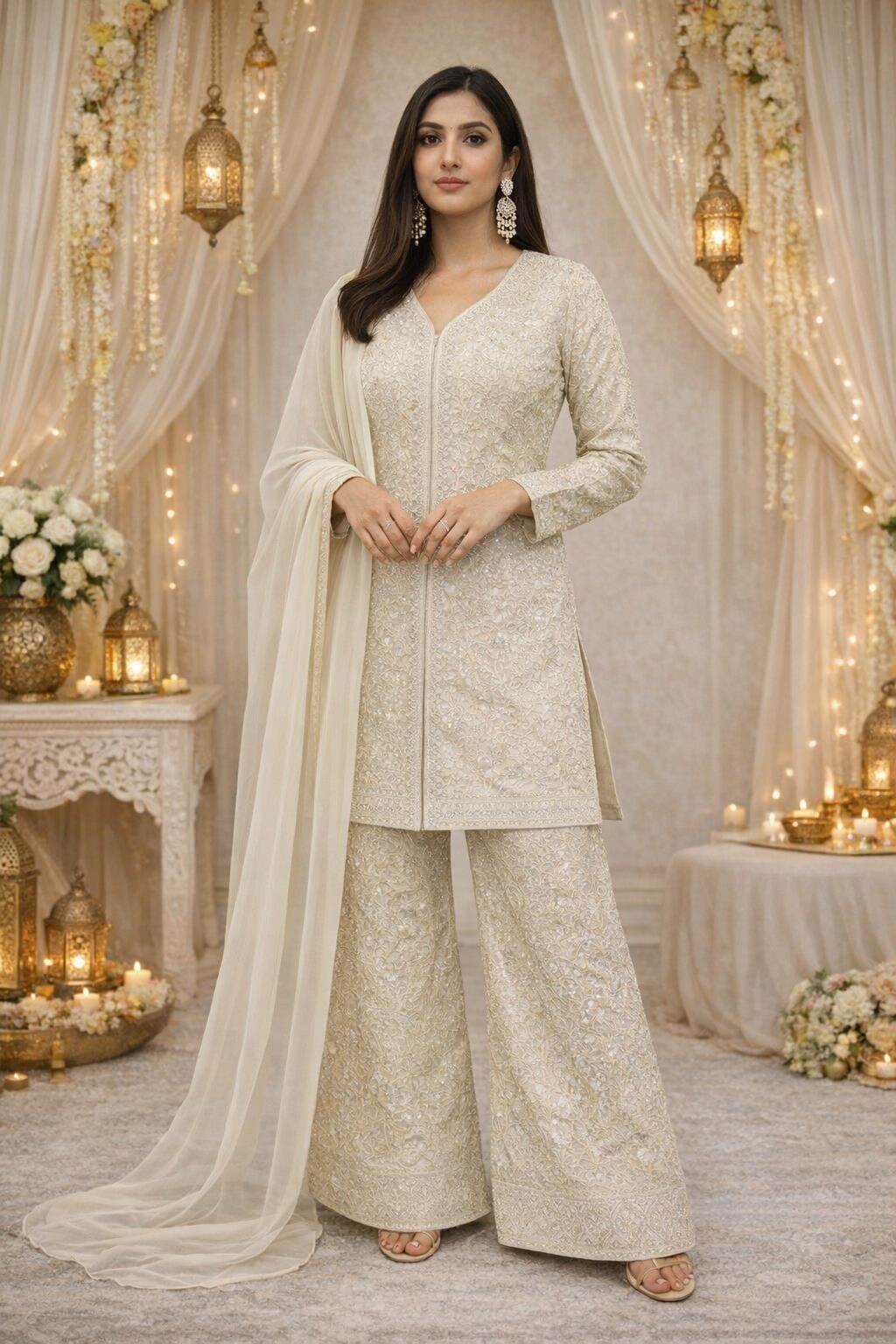 Cream Color Party Wear Designer Indo-Western Plazo Suit