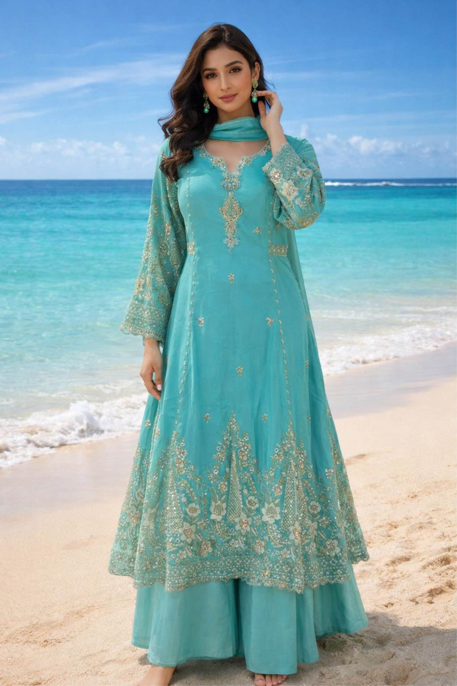 Sky Color Party Wear Designer Indo-Western Plazo Suit