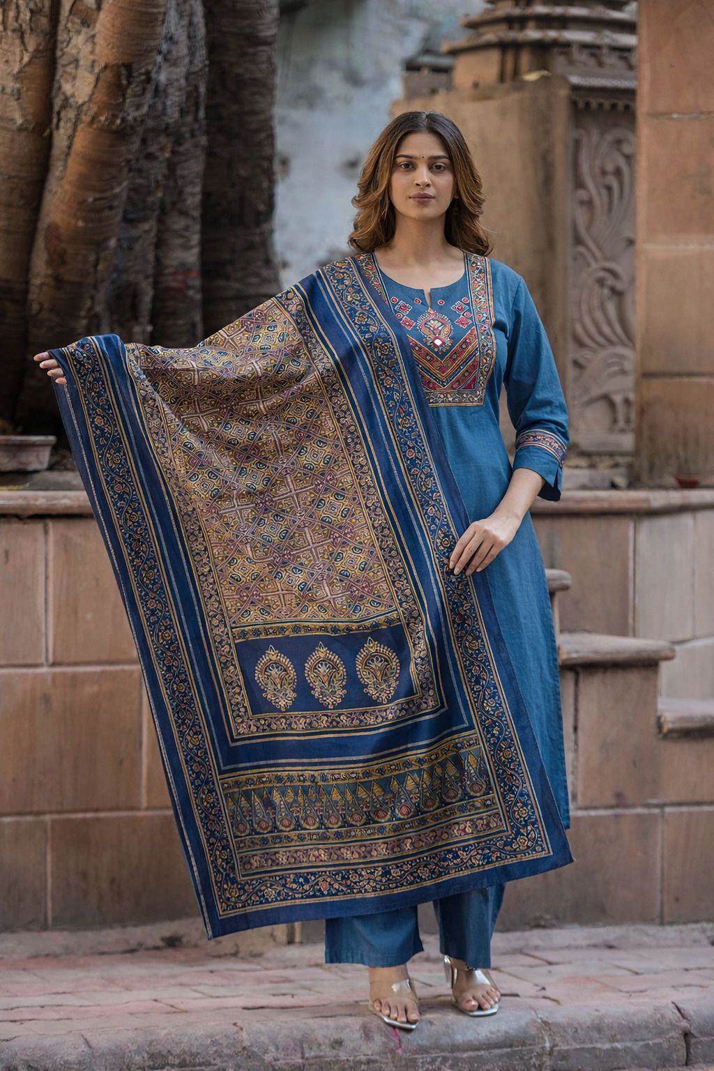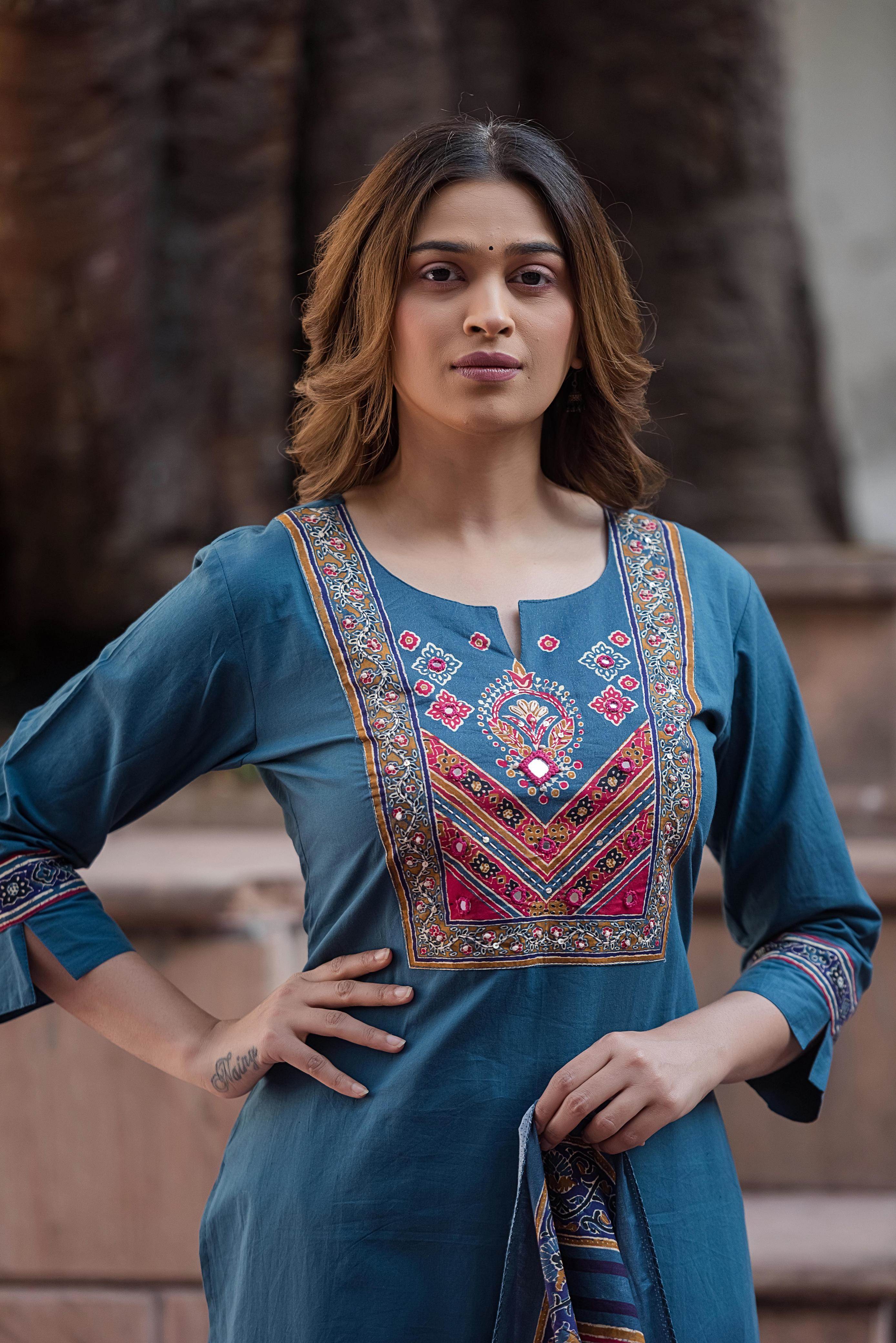 Peacock Colour Designer Cotton Kurti Set With Dupatta :: ANOKHI FASHION