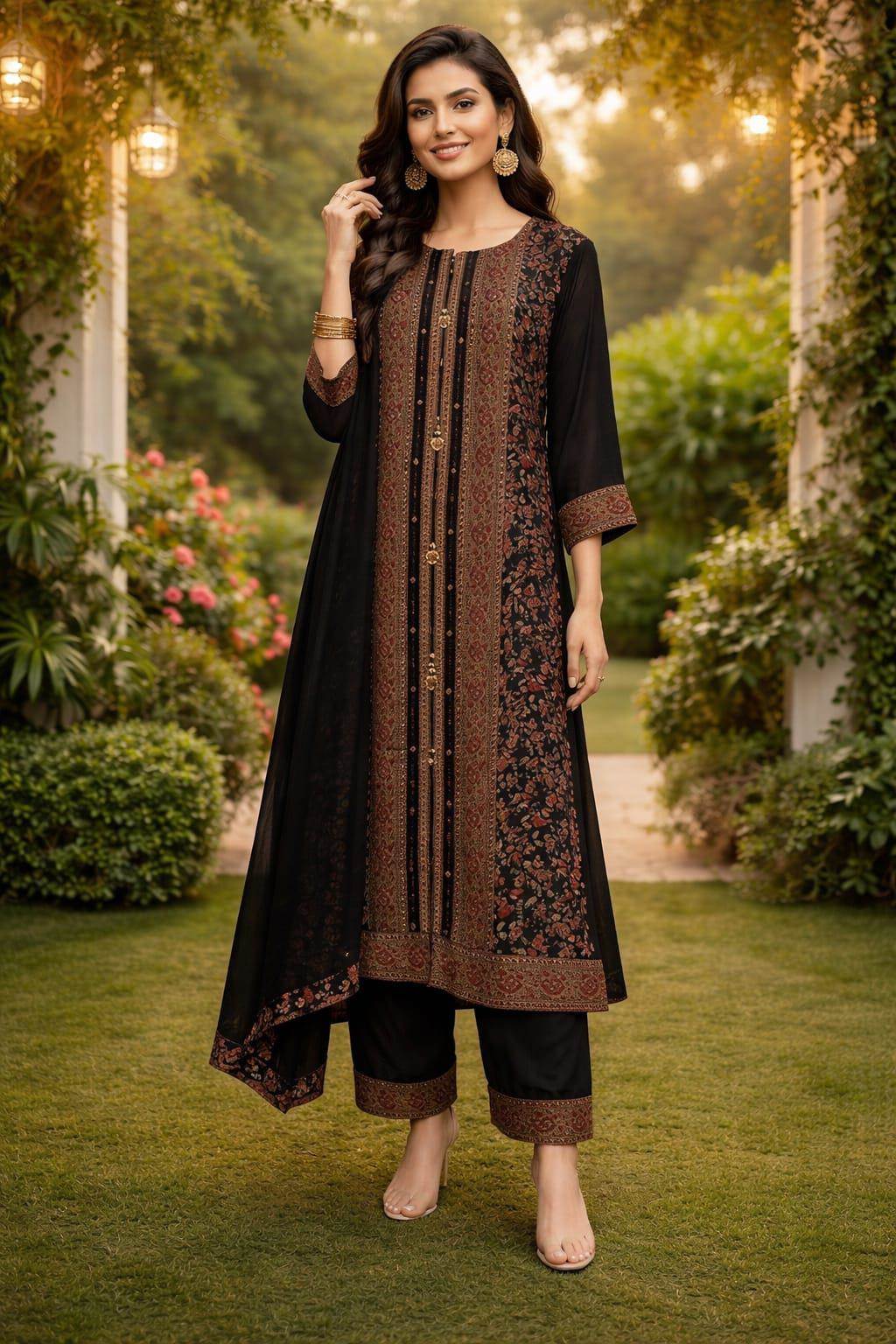 Black Colour Designer Ajarak Print Kurti Set With Dupatta