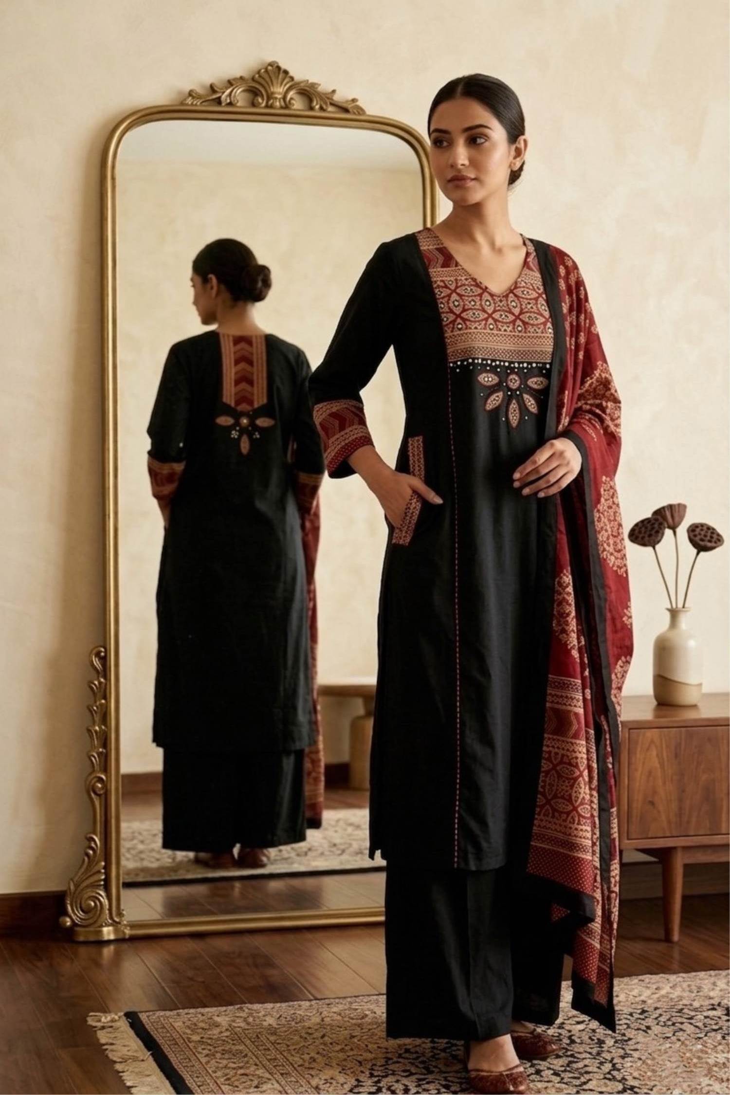 Black Colour Pure Cotten Kurti Set With Dupatta :: ANOKHI FASHION
