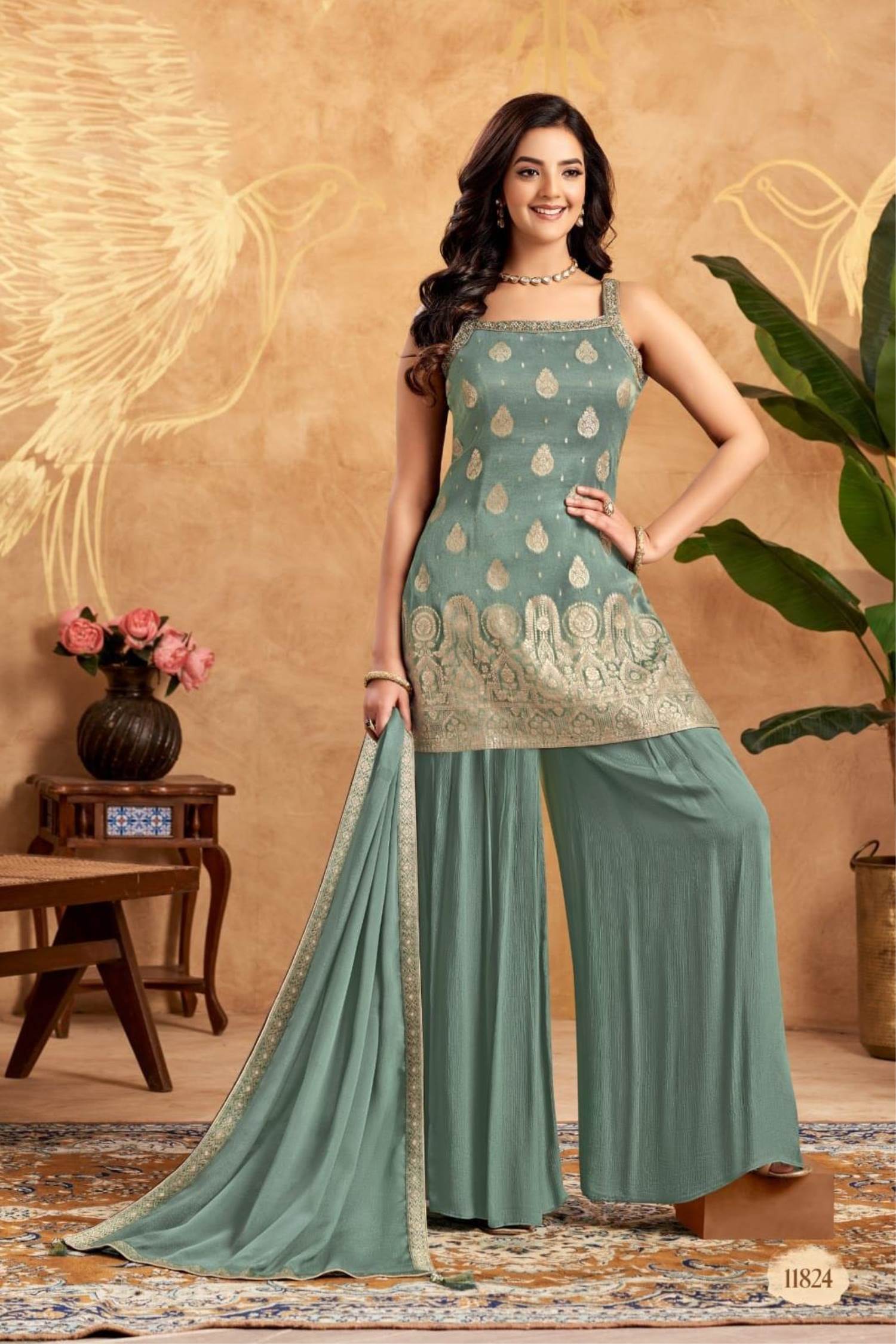Green Color Party Wear Designer Indo-Western Plazo Suit