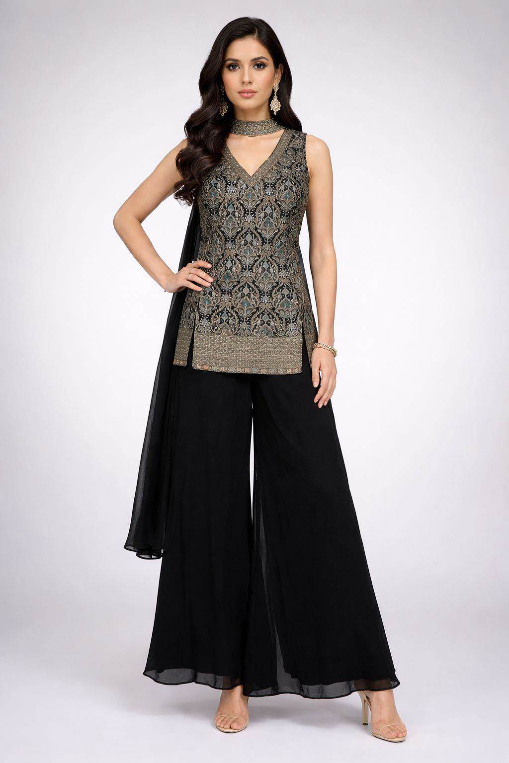 Black Colour Party Wear Designer Indo-Western Plazo Suit