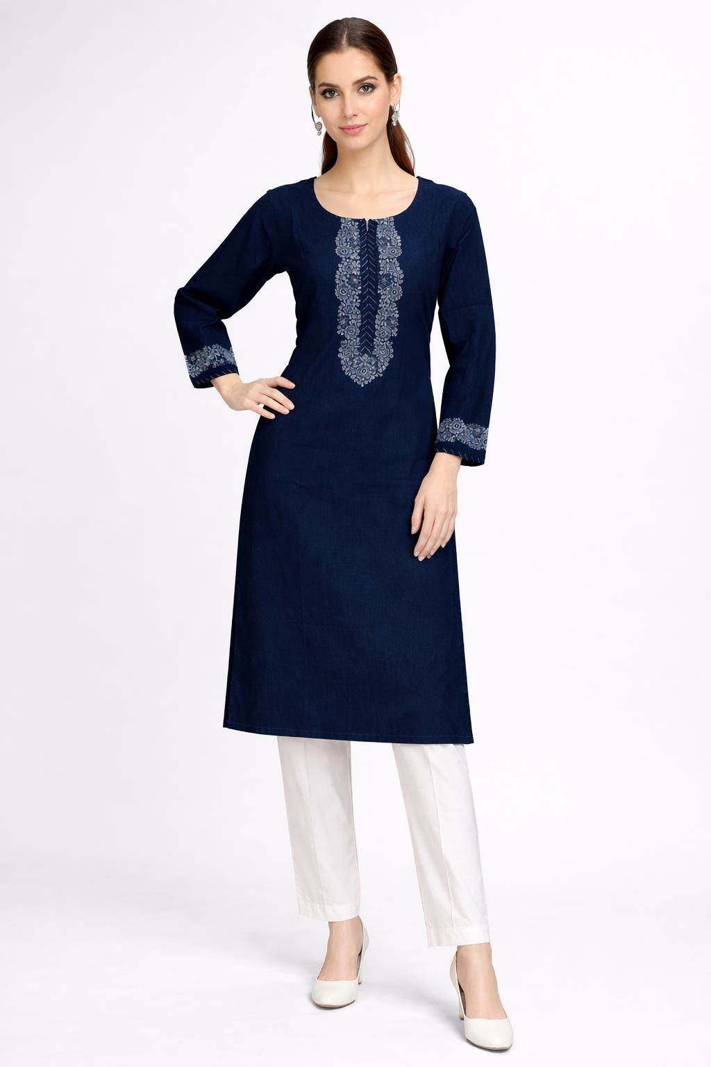 Denim Blue Colour Casual Wear Straight Kurti