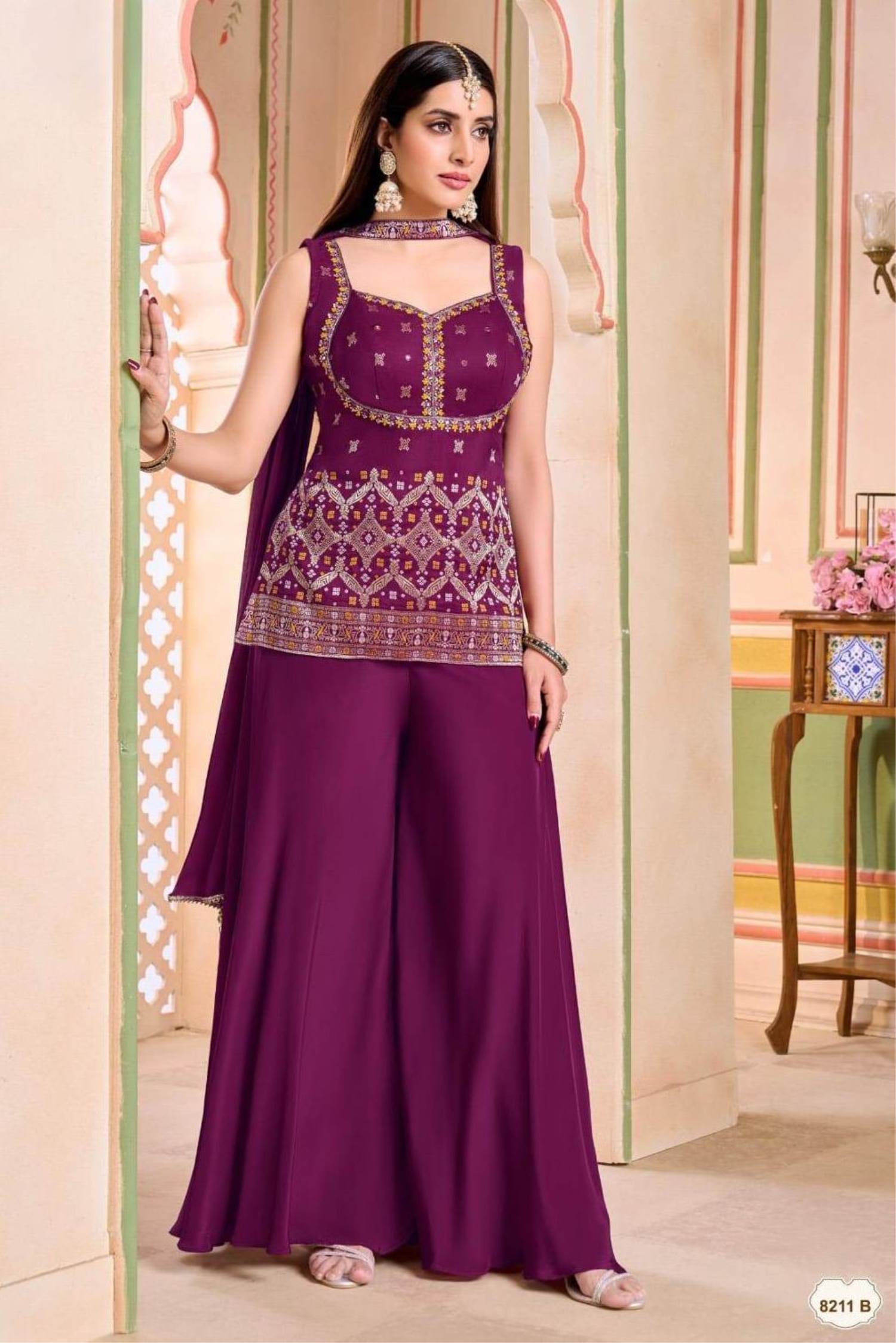 Wine Colour Party Wear Designer Indo-Western Plazo Suit