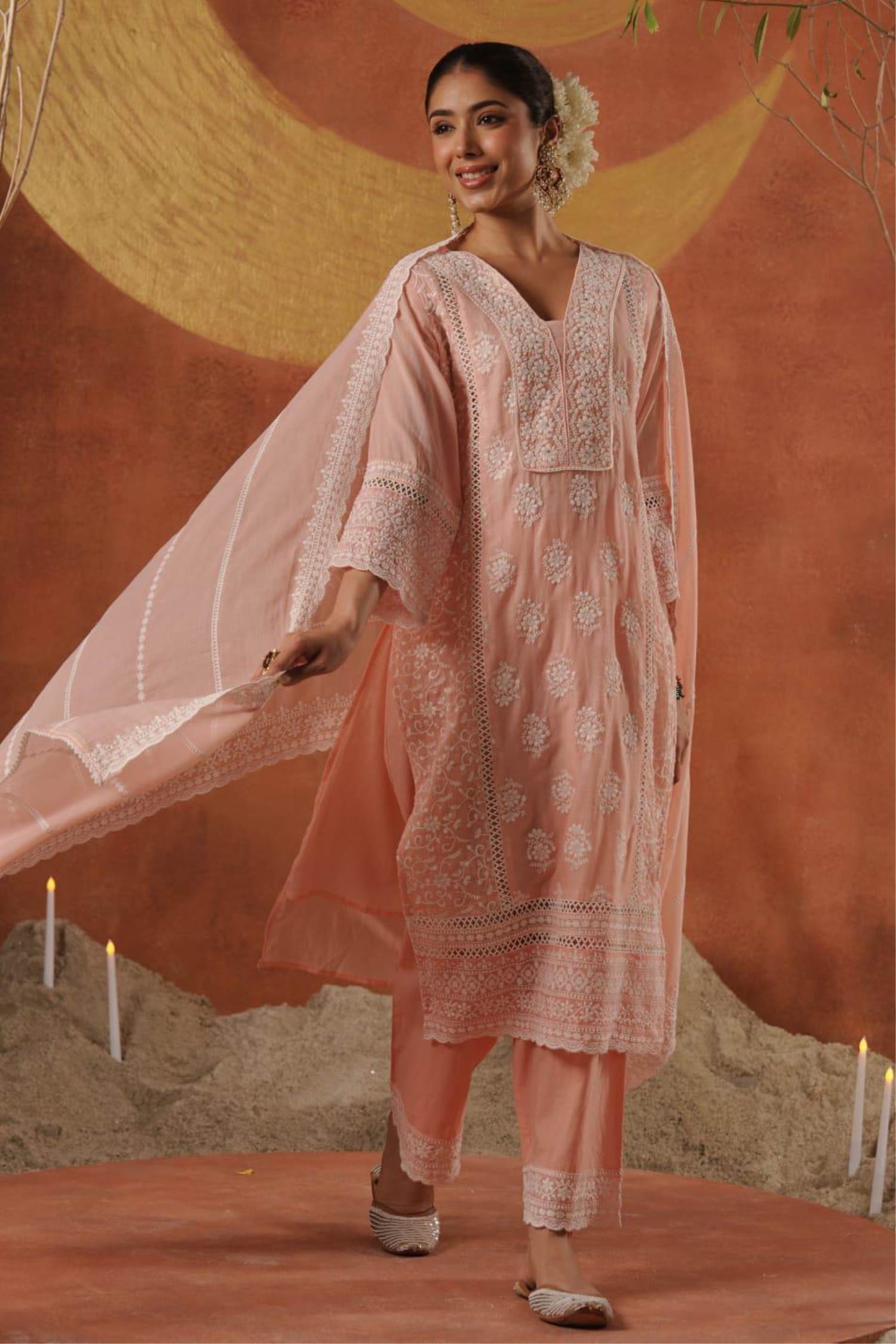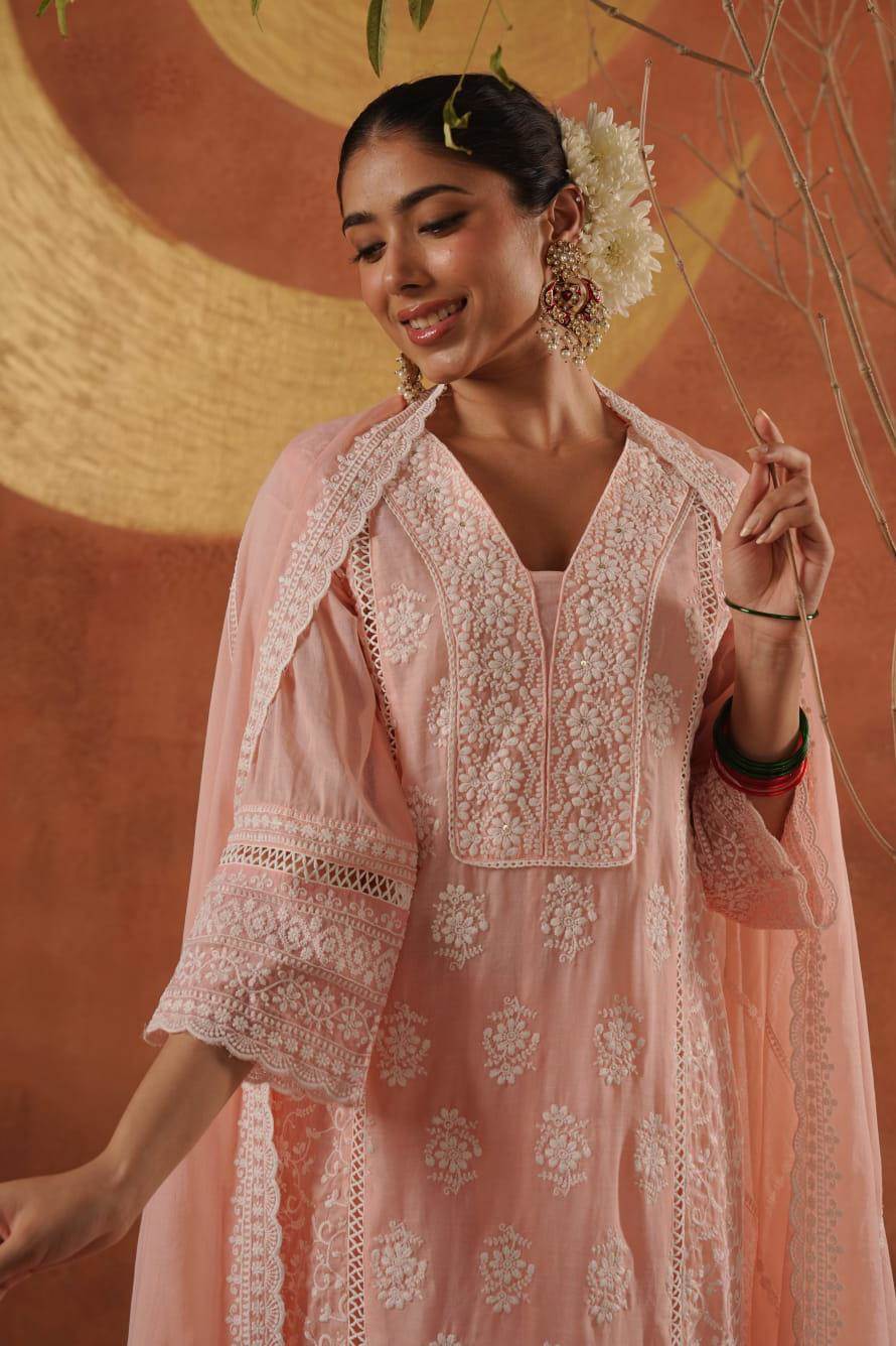 Peach Colour Pure Lakhnavi Designer Kurti Set With Dupatta :: ANOKHI FASHION