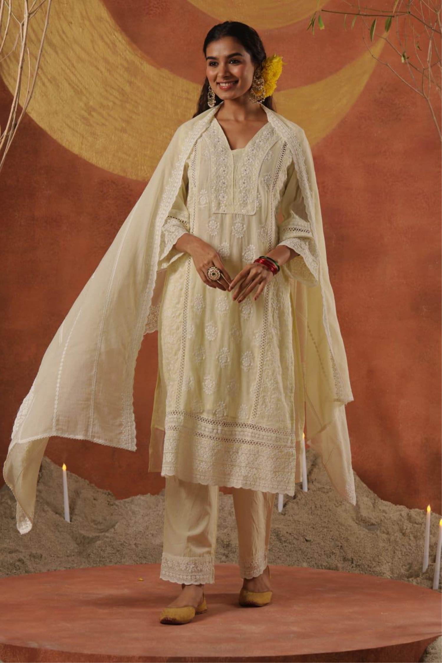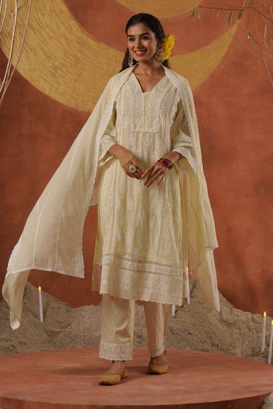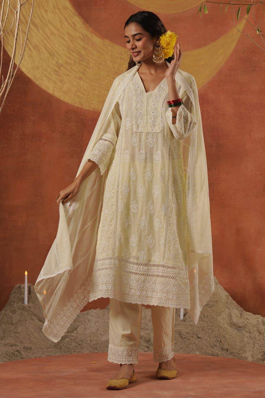 Lemon Colour Pure Lakhnavi Designer Kurti Set With Dupatta :: ANOKHI FASHION