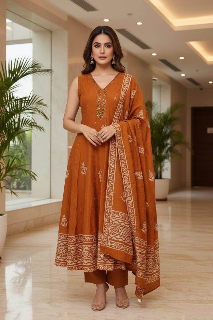 Rust Colour Designer Batik Print Kurti Set With Dupatta