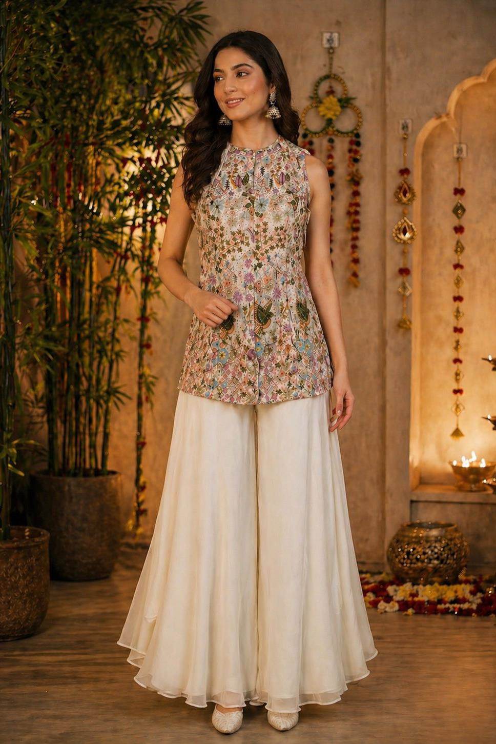 White Color Party Wear Designer Indo-Western Plazo Suit